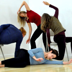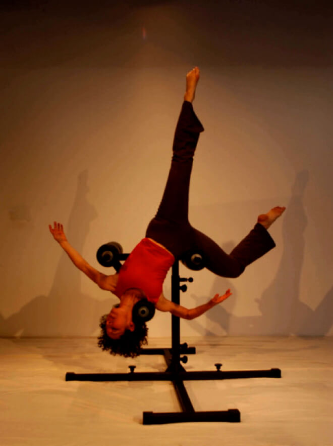 A través de una rica variedad de exploraciones de la respiración, el sonido y el movimiento multidimensional en diversas relaciones con la gravedad, tales como estar de pie, sentado, al revés o colgado de plataformas o sillas, experimentamos nuestra capacidad de expresión libre y sin restricciones. Cuando reforzamos nuestros cuerpos para pasar con fluidez de una relación a otra con la gravedad, aumentamos nuestra capacidad de adaptación y resistencia en todas las circunstancias. En lugar de esculpir y aislar repetidamente partes del cuerpo o músculos concretos, nos centramos en la fuerza de todo el sistema en su conjunto.