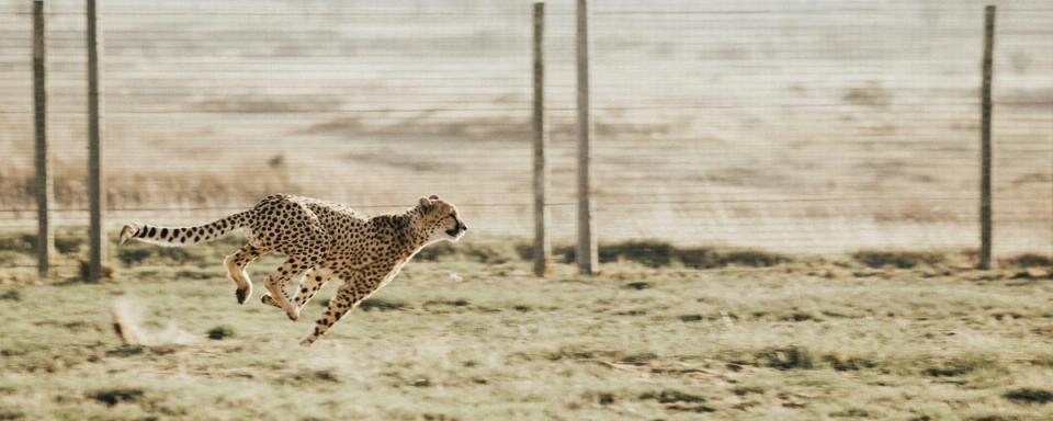 Notice too, how the cheetah’s head never wavers from its intention of moving forward with eyes on the prey. The tail is in congruence with the head movement, straight out, most of the time, with full elongation from head to tail through its torso. The cheetah comes into a complete gathering of its tissues, a C curve to gain the power to achieve complete full extension of its body as it follows through the movement with all four paws off the ground.